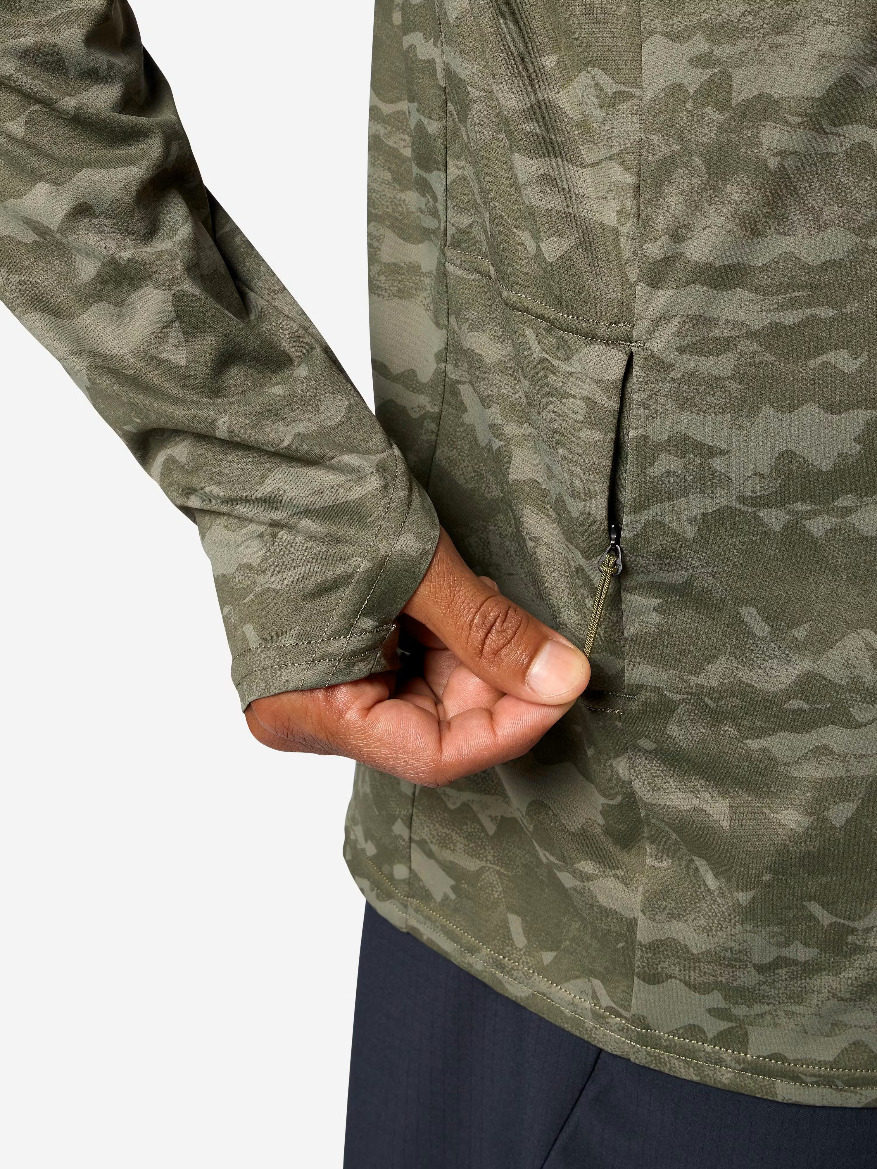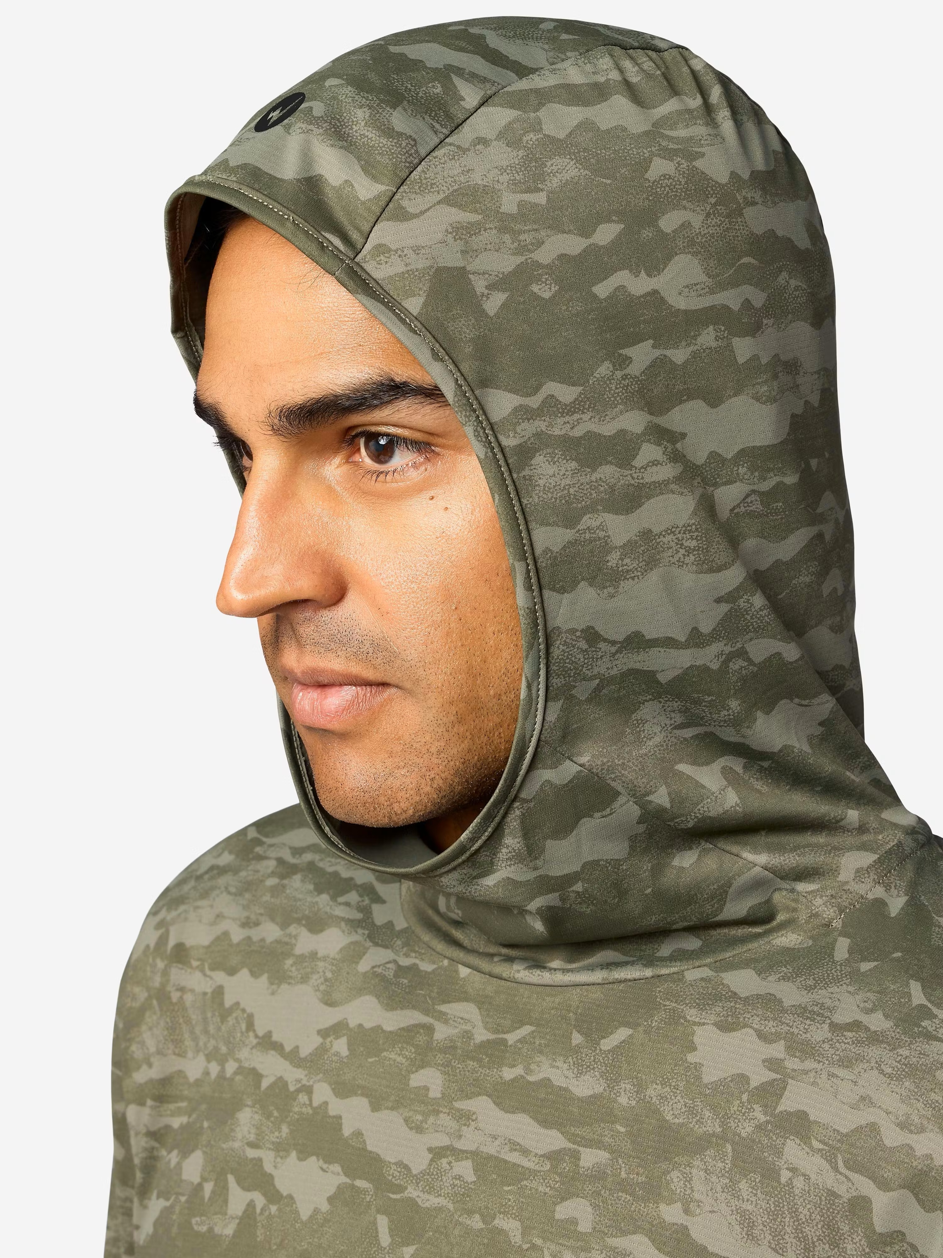 Made from 100% recycled polyester, the fabric is engineered for efficient moisture management and long-lasting comfort. Flatlock seams help reduce friction during activity, while the fitted hood provides additional sun coverage without restricting visibility or movement.