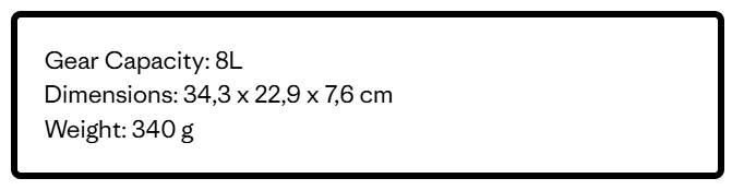 All fabrics, spacer mesh and static mesh are 100% recycled (stretch mesh is 84% recycled),body has a PFC-free DWR finish (durable water repellent coating that does not contain perfluorinated chemistry); pack volume is 8 liters