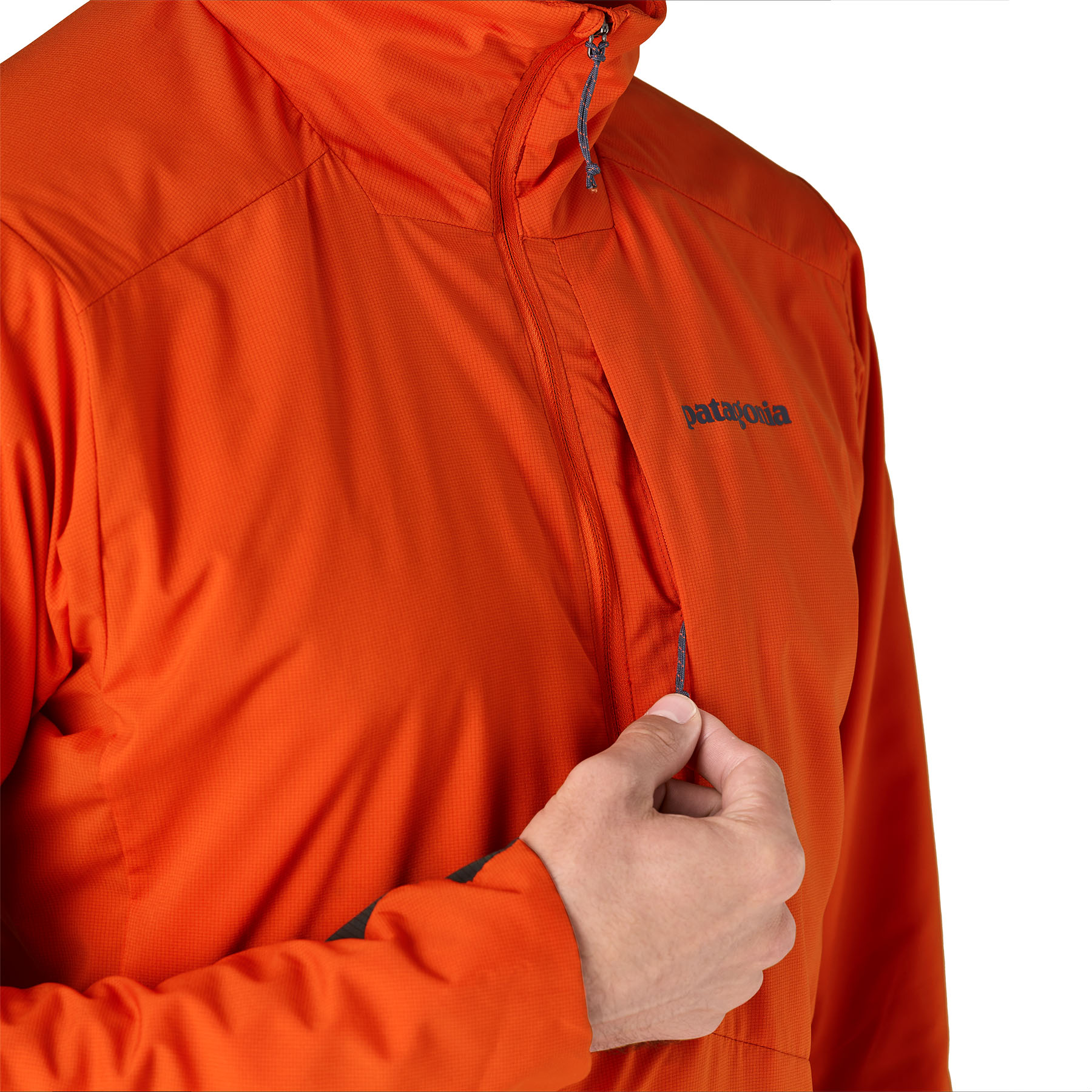 Low-profile, generously sized, vertically zippered chest pocket keeps essentials warm and close at hand; pullover easily self-stuffs into it, with a carabiner clip-in loop
